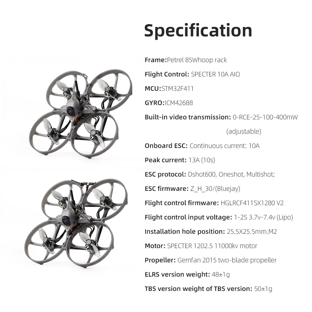 The HGLRC Petrel85 Tinywhoop is a four-axis 2S brushless motor FPV drone perfect for indoor or outdoor flying. With the new SPECTER 10A 5-in-1 flight control, it includes 4 ESCs, a flight control system, an image transmitter, and an ELRS receiver. The RunCam nano4 lens provides clear and sharp images, while the onboard 400mw analog video transmission offers stable and efficient function with up to 48 channels. This drone is equipped with a standard 1202.5-11000kv brushless motor for powerful performance, paired with a Gemfan 1610 two-blade propeller for smooth flights.