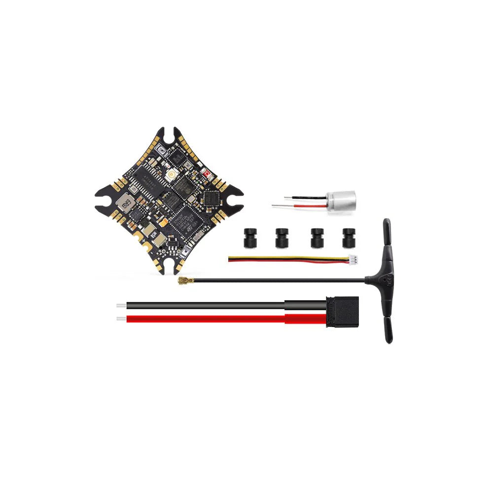 This is an F411 15A 2-4S ELRS AIO integrated brushless flight controller that includes UART serial ports and on board ExpressLRS 2.4G. Compared to the SPI receiver, the integrated UARTS serial port receiver offers better performance and signal stability. Additionally, it eliminates the limitations of the SPI receiver such as limited functions, complicated setup, and short signal distance. The integrated serial port ELRS receiver also solves the issue of finding a suitable location for the receiver during setup. The board features a reserved IPEX receiver seat and a T-shaped antenna, making it easy to navigate through challenging indoor flight environments. The ELRS receiver stands out for its high sensitivity, fast refresh rate, and low latency, making it a top choice among FPV enthusiasts. With support for 2-4S batteries, this AIO flight controller is also compatible with popular frames such as 75mm/85mm whoop/3-inch lightweight and toothpick/etc.